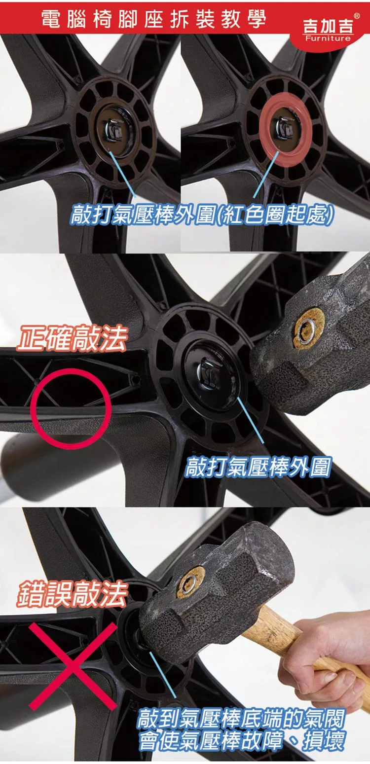 拆解氣壓棒,請敲打氣壓棒底部外圈,紅色圈起處,請勿敲打正中心,會打到氣閥,會使氣壓棒故障!