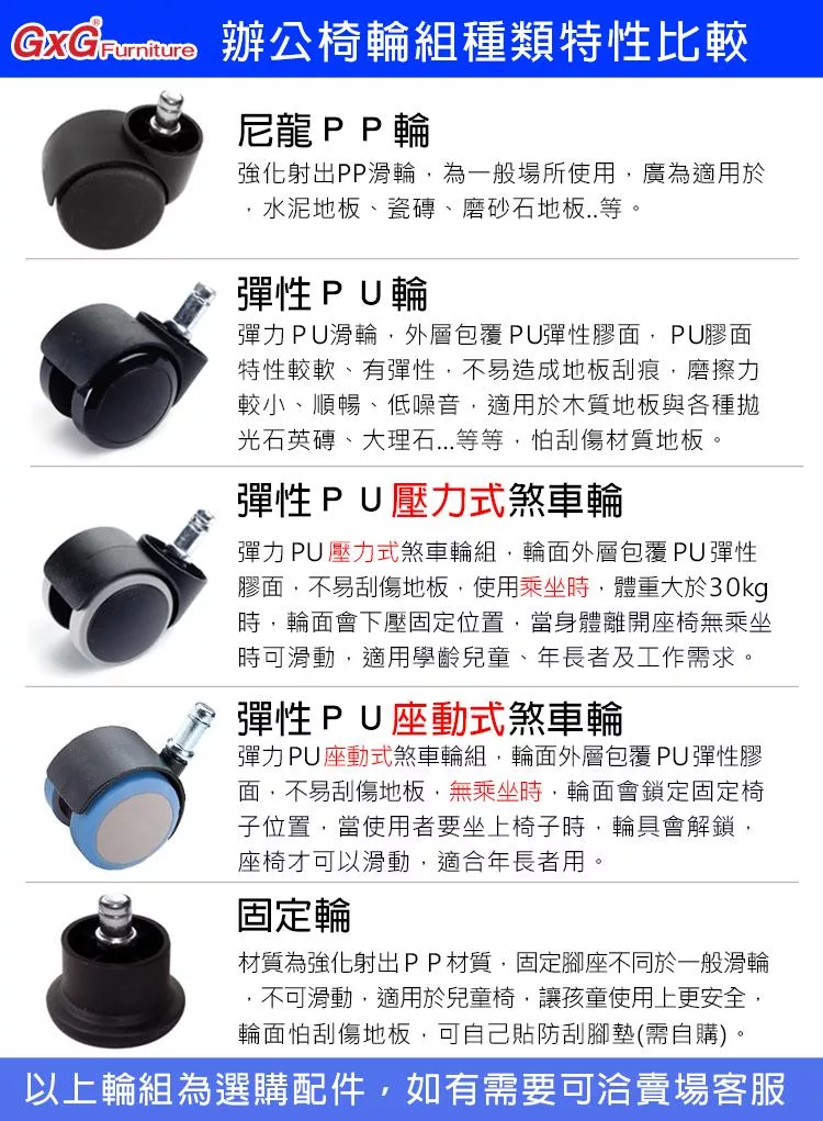 使用加大輪才能正常使用,該類型電腦椅不可使用5cm的一般輪,容易發生上述說的,氣壓棒撞到地板。