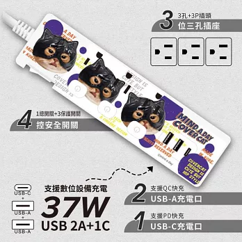 【正版授權】SNOOPY史努比 PD 37W平貼式延長線 按壓式4開3插+USB/Type-C延長線 1.8M 環遊世界