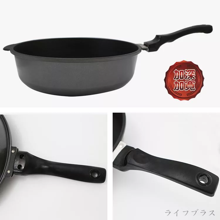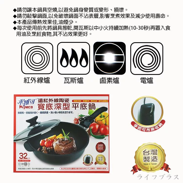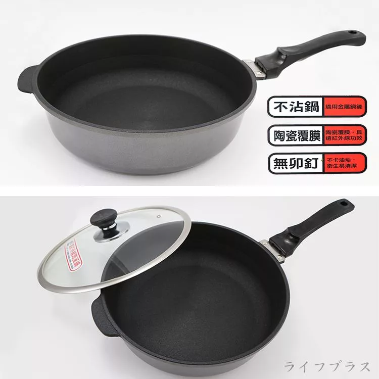 在廚房中,擁有一款優質的鍋具是烹飪成功的關鍵,此款鍋具台灣製造品質安心,通過SGS檢測品質安心,採用台灣傳統手工合金鑄造精工製作,鍋身特殊螺紋結構,增加表面硬度,適用圓角金屬鐵鏟,無鉚釘一體成型設計,不卡油垢好清洗,傳熱快且均勻,採用遠紅外線陶瓷耐用不沾塗層處理,達到不沾鍋身抗黏OK,不易粘黏食材,煎煮食材只需少許油 ,省油,省瓦斯,平底加深加寬型化設計,料理食物好鍋具,適用瓦斯爐、電爐、紅外線爐、鹵素爐,不適用IH電磁爐,讓您輕鬆掌控每一道料理。