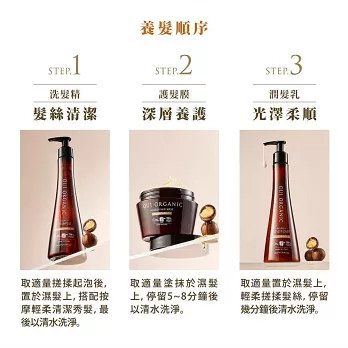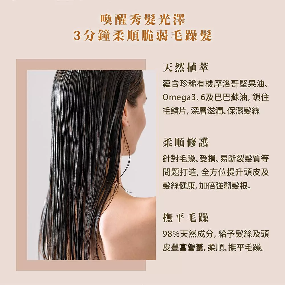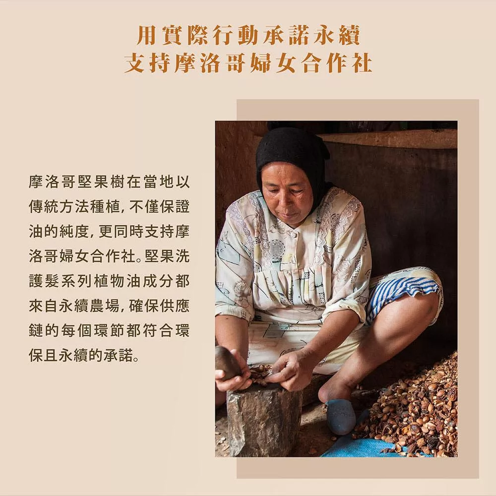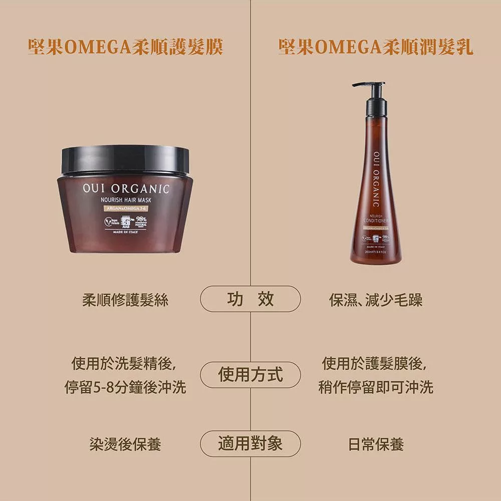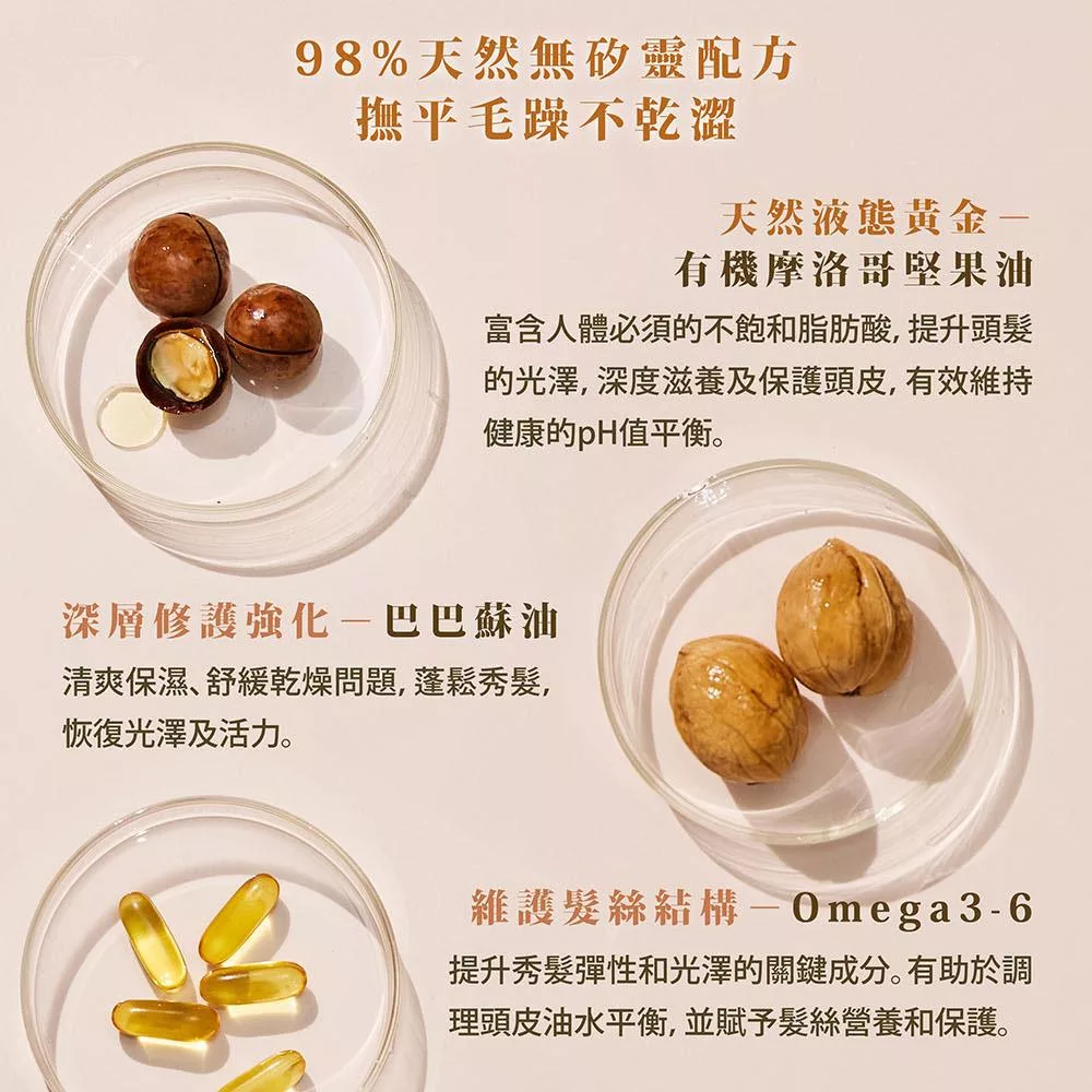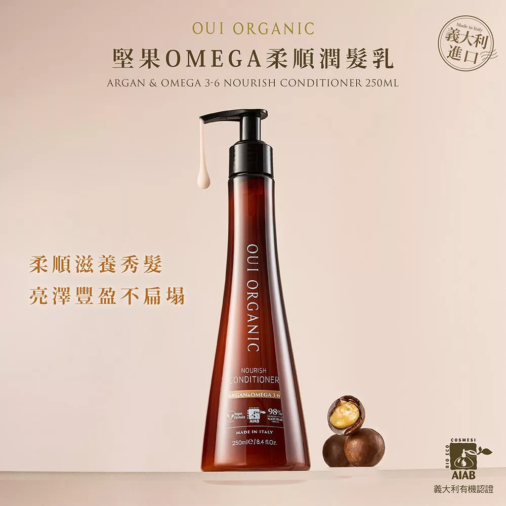 堅果OMEGA柔順潤髮乳添加有機摩洛哥堅果油、巴巴蘇油、Omega 3、Omega 6、維生素E,保濕滋養髮絲、撫平毛躁,使髮絲柔順有光澤。