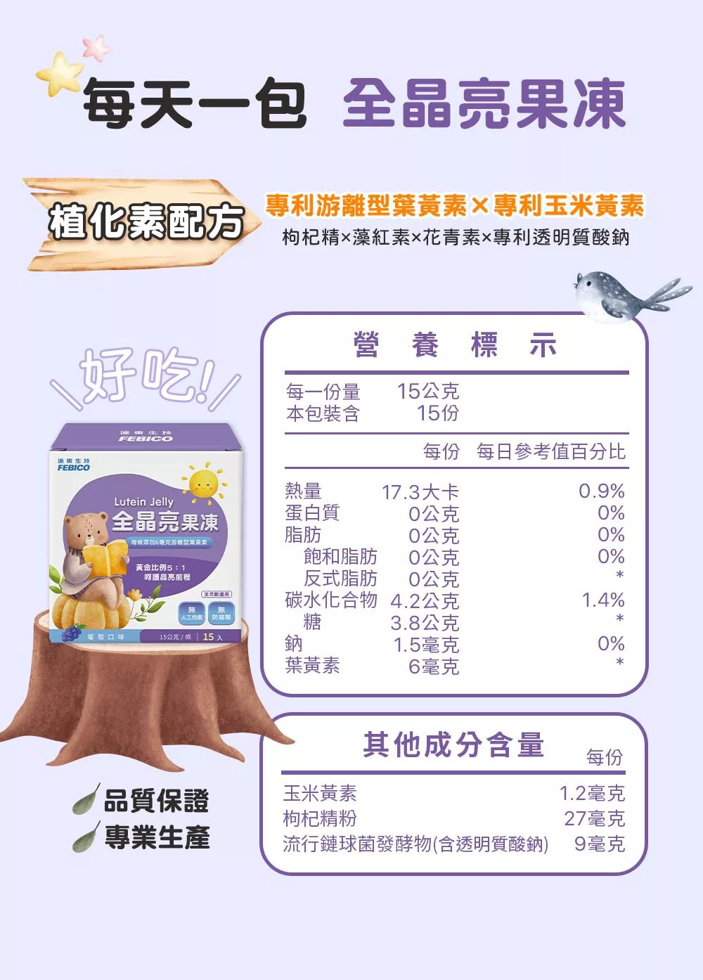 成分:純水、砂糖粉、紅葡萄濃縮汁、果凍膠(洋菜粉、 蒟蒻粉、刺槐豆膠、玉米糖膠、鹿角菜膠、氯化鉀、葡萄糖)、檸檬酸、檸檬酸 鈉、葡萄香料、專利金盞花萃取(含游離型葉黃素、玉米黃素) (金盞花萃取、糊精、糖、阿拉伯膠、辣椒粉)、枸杞精粉(枸杞、氧化澱粉(樹薯)、麥芽糊精)、專利流行鏈球菌發酵物(含透明質酸鈉)、紅藻粉(紅藻(含蝦紅素)、麥芽糊精、 卵磷脂、二氧化矽、抗壞血酸棕櫚酸酯(抗氧化劑)、混合濃縮生育醇(抗氧化劑)、迷迭香萃取物)、黑豆萃取物(含花青素) (黑豆、 異麥芽糊精)、蔗糖素( 甜味劑) 。