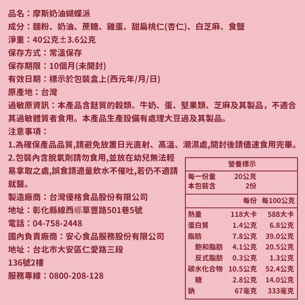 • 【內容量(重量)】蝴蝶派:40g±3.6g