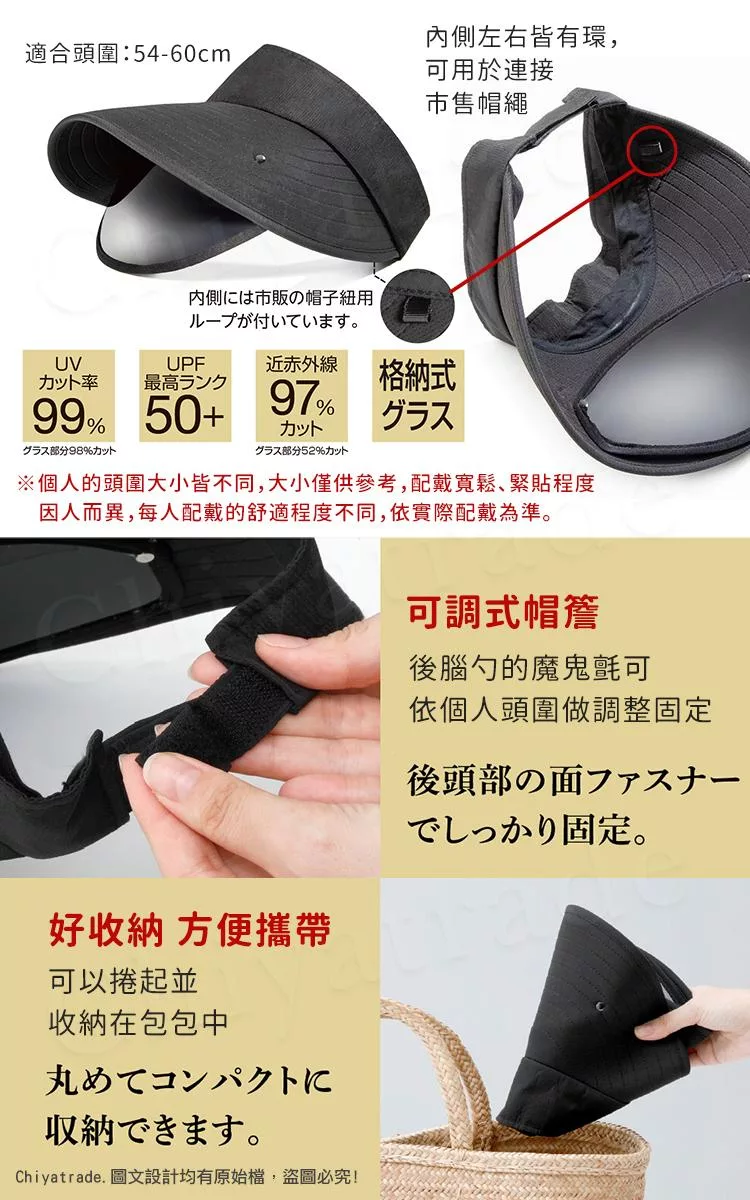 帽簷內建可伸縮遮光板,想用就拉出,可以捲起並收納在包包中,非常方便~