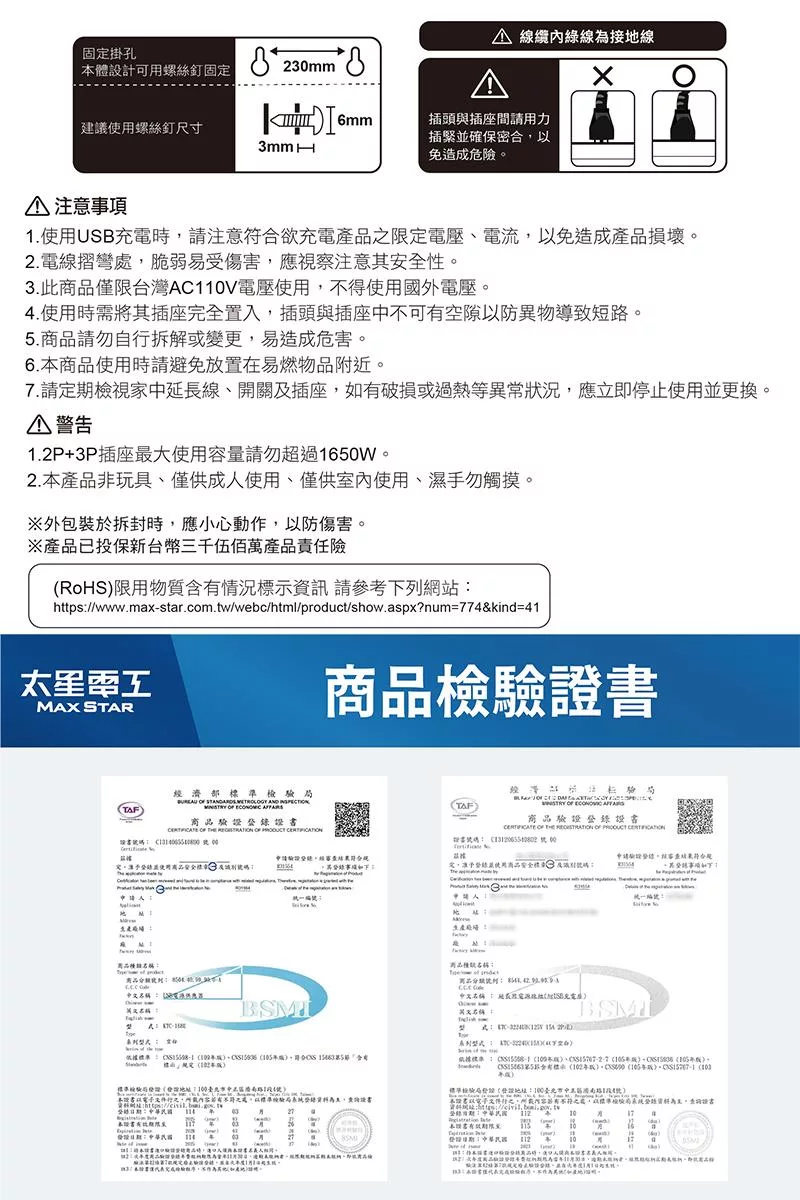 1.2P+3P插座最大使用容量請勿超過1650W。