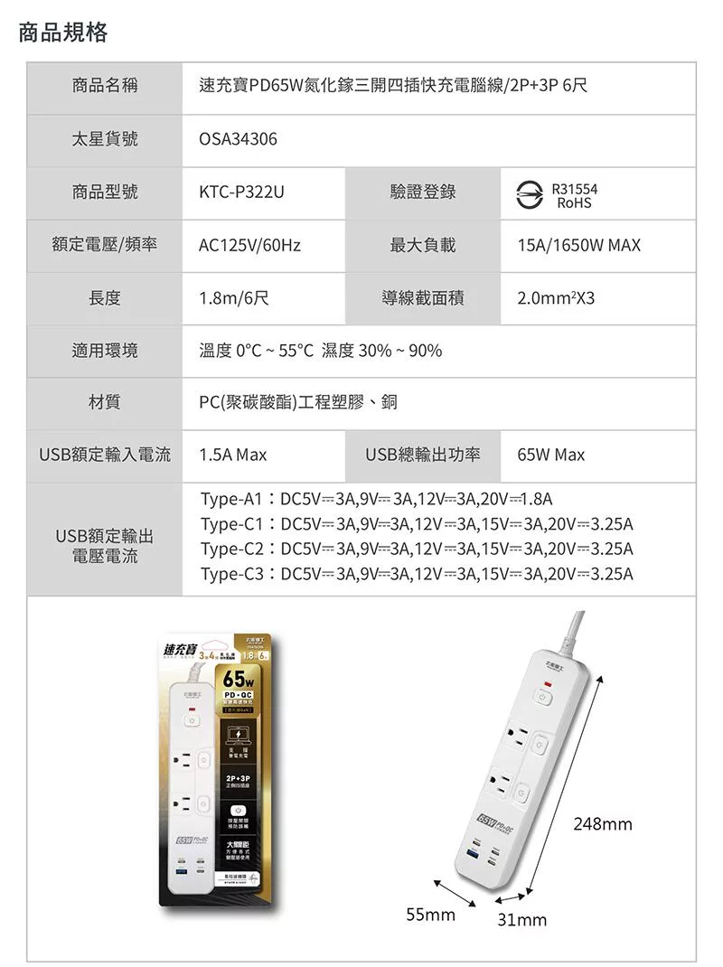 【太星電工】速充寶PD65W氮化鎵三開四插快充電腦線/2P+3P/6尺 過載保護/防火/筆電 快充 OSA34306