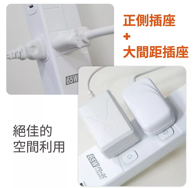 All in one PD65W氮化鎵GaN PTP高溫斷電 按壓式3開4插 USB延長線 110V專用 極致白