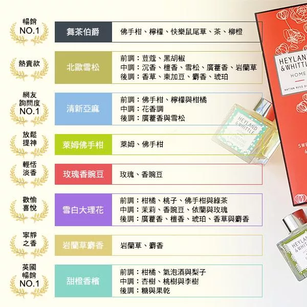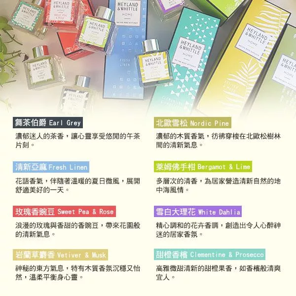 (香味:北歐雪松/舞茶伯爵/雪白大理花/萊姆佛手柑/玫瑰香豌豆/甜橙香檳/岩蘭草麝香/清新亞麻)