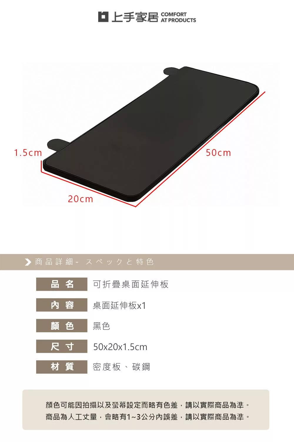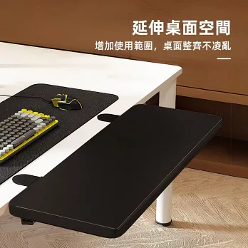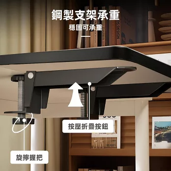 把延伸板夾上桌邊,立刻多出一片平整工作區。鋼製支架穩固承重,平齊桌面支撐雙臂,長時間打字也舒適。需要時放下使用,不用時90°折疊收起,工作與收納都變得俐落有序。