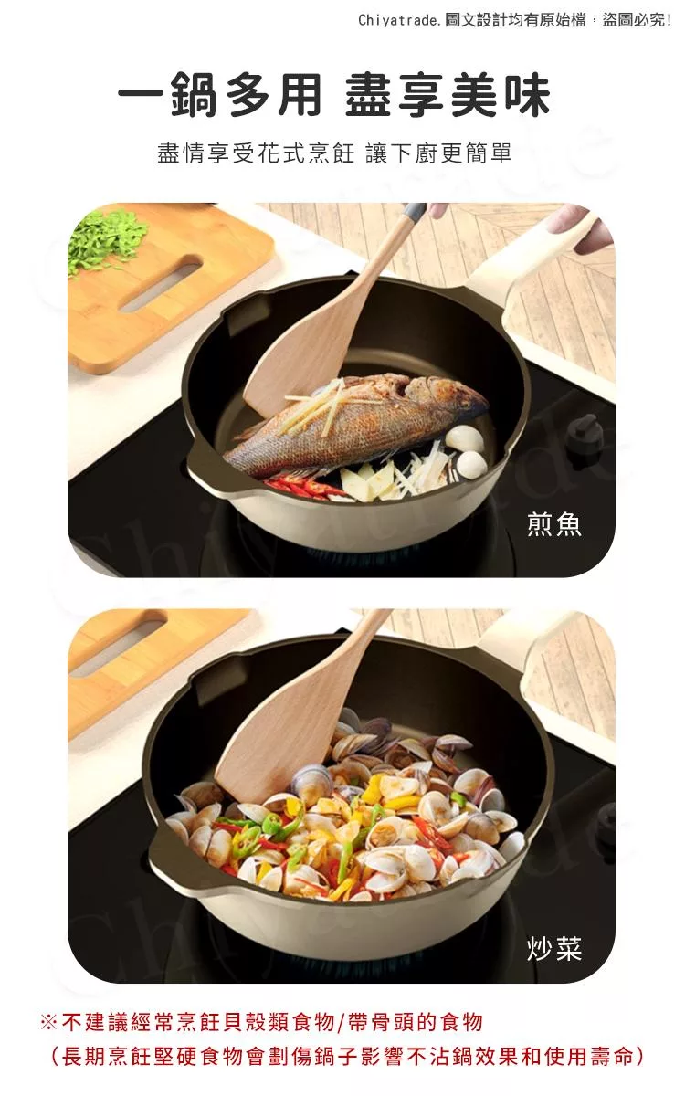 ※不建議經常烹飪貝殼類食物/帶骨頭的食物(長期烹飪堅硬食物會劃傷鍋子影響不沾鍋效果和使用壽命)