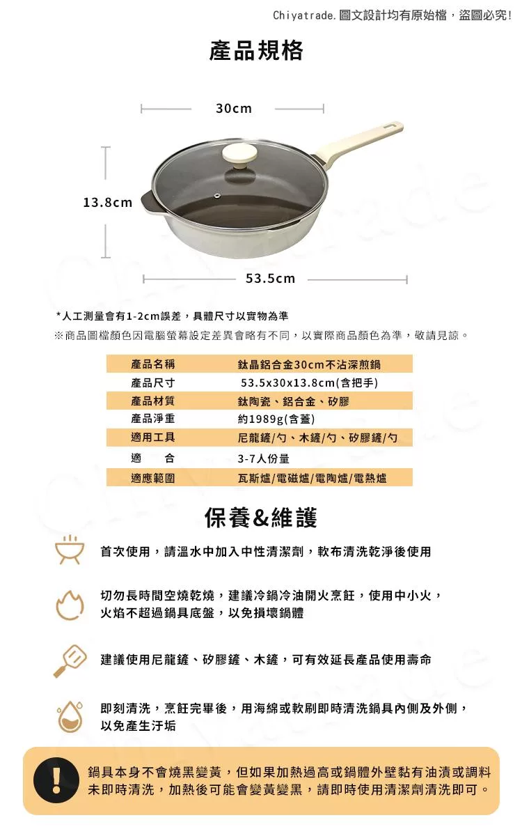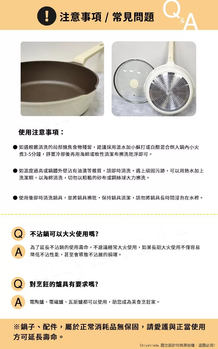 溫馨提醒:切勿高溫乾燒、金屬物磨損、熱鍋冷水清洗,