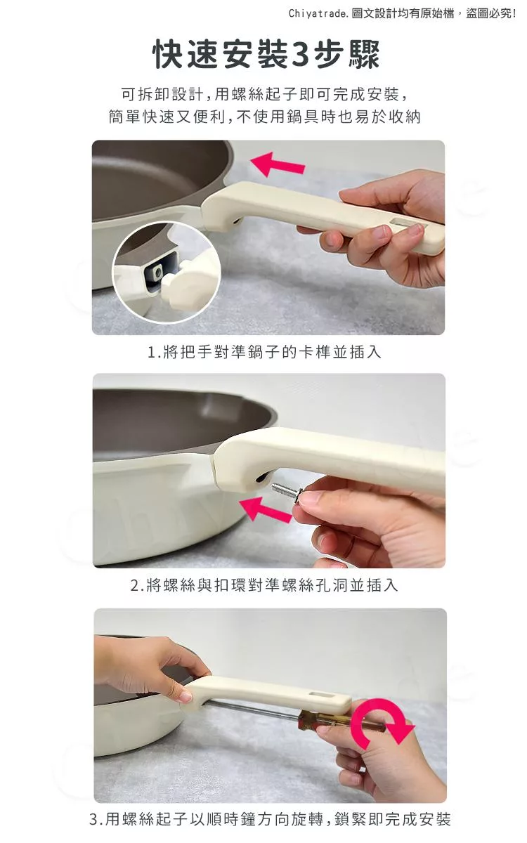 ※嚴禁手柄與鍋蓋把手長時間浸水,防止變形,影響使用壽命!