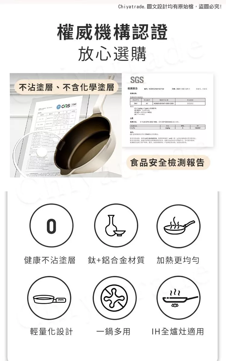 鍋具通過權威機構認證,無化學塗層,可以放心使用