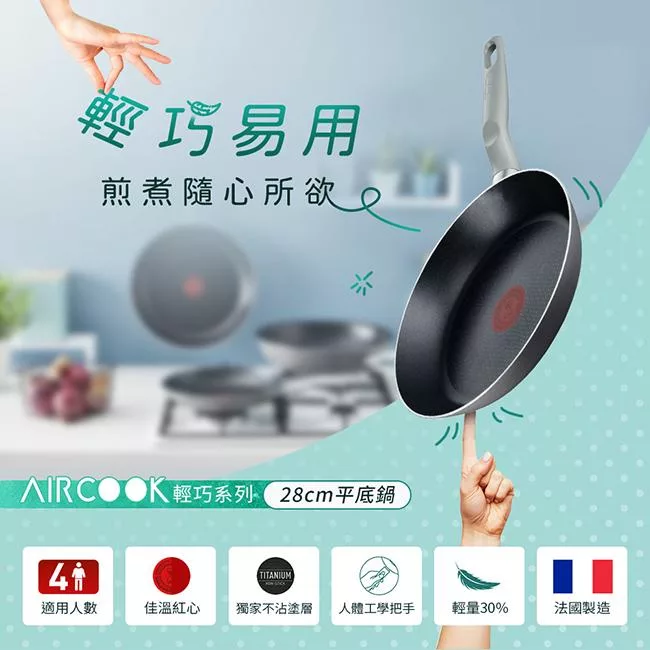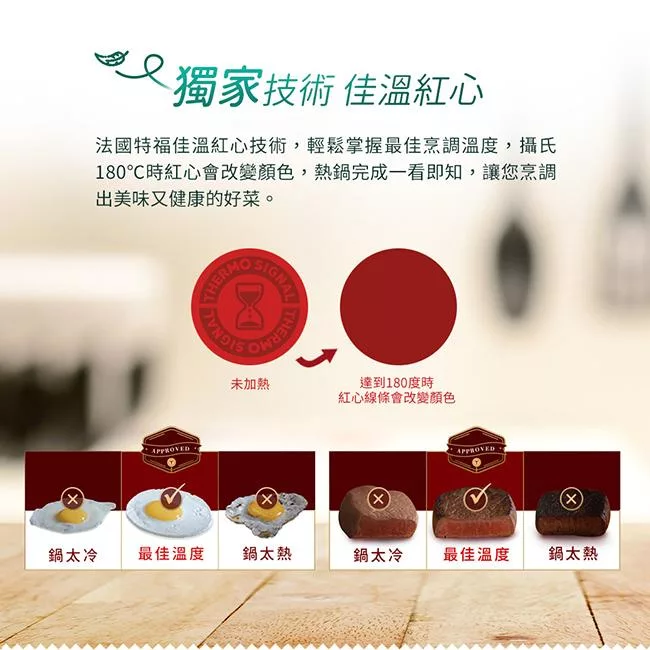 法國特福佳溫紅心技術,輕鬆掌握最佳烹調溫度,攝氏180°C時紅心會改變顏色,熱鍋完成一看即知,讓您烹調出美味又健康的好菜。