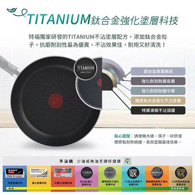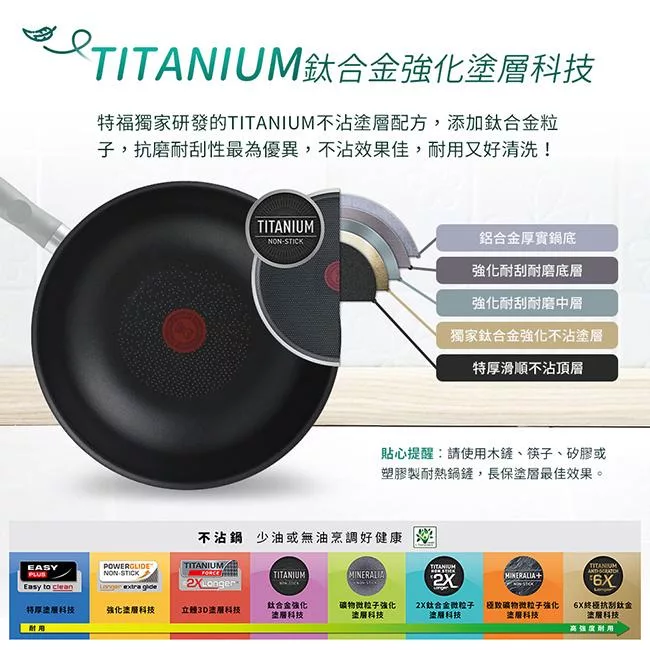 特福獨家研發的TITANIUM不沾塗層配方,添加鈦合金粒子,抗磨耐刮性最為優異,不沾效果佳,耐用又好清洗!