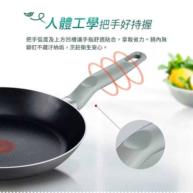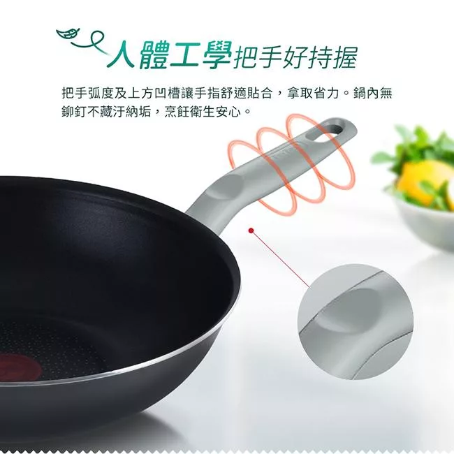 把手弧度及上方凹槽讓手指舒適貼合,拿取省力。鍋內無鉚釘不藏汙納垢,烹飪衛生安心。