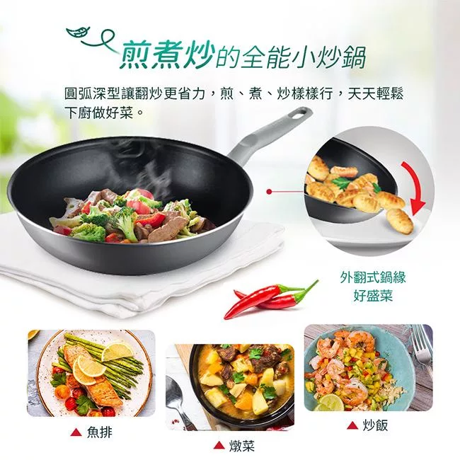 圓弧深型讓翻炒更省力,煎、煮、炒樣樣行,天天輕鬆下廚做好菜。外翻式鍋緣起鍋盛菜更順手。