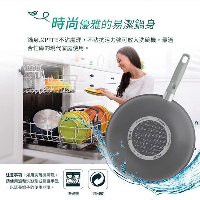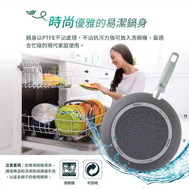 鍋身以PTFE不沾處理,不沾抗污力強,可放入洗碗機,最適合忙碌的現代家庭使用。