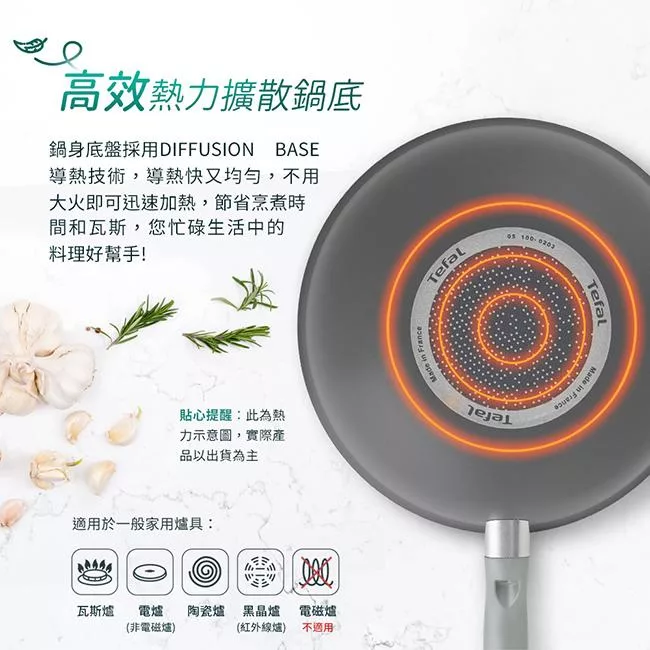 4.特福不沾鍋因鍋底設計具有高傳熱功能,建議用中小火烹調即可,節省能源又可避免營養流失,更能減少油煙的產生。