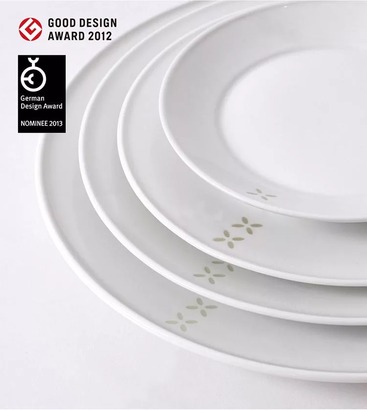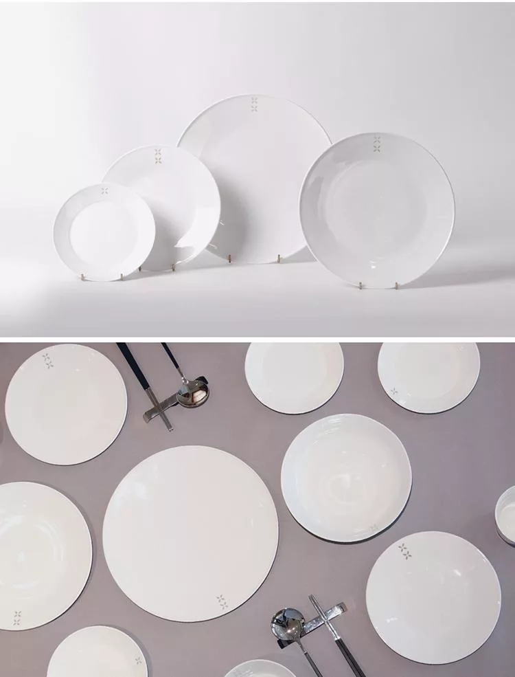 米通瓷,亦稱玲瓏瓷。製作時,於泥坯上細心刻出米粒狀鏤孔,填入玲瓏釉料,再入窯焙燒而成。本套器皿,線條簡潔純粹,下緣表面無釉處理,更添細膩手感。除了作食皿使用,亦是生活空間裡恬淡逸雅的美物。此件設計,延襲古代米通工藝,技成八瓣葉狀,其冰瑩剔透,似雪。影隨光走,猶如冬時細雪,靜悄紛紛。