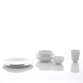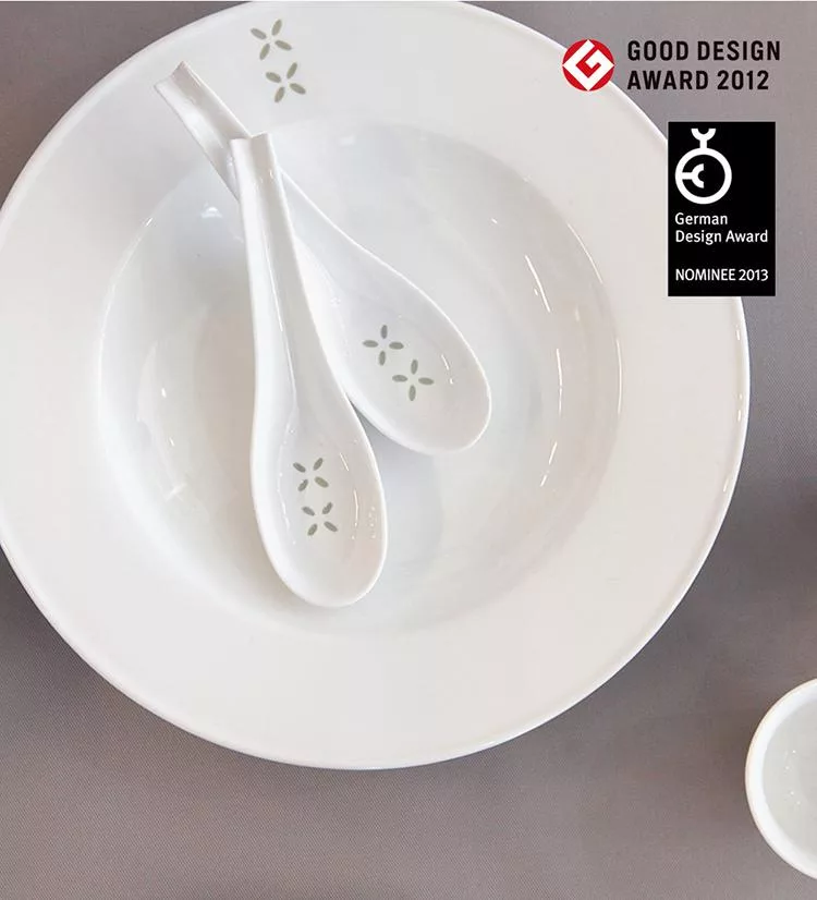 米通瓷,亦稱玲瓏瓷。製作時,於泥坯上細心刻出米粒狀鏤孔,填入玲瓏釉料,再入窯焙燒而成。本套器皿,線條簡潔純粹,下緣表面無釉處理,更添細膩手感。除了作食皿使用,亦是生活空間裡恬淡逸雅的美物。此件設計,延襲古代米通工藝,技成八瓣葉狀,其冰瑩剔透,似雪。影隨光走,猶如冬時細雪,靜悄紛紛。
