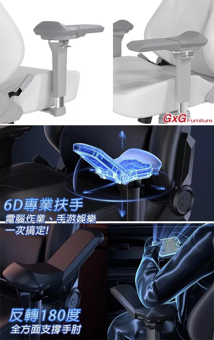 扶手面可上翻,前、後,內外以及左右約15°旋轉,可翻轉180度向後延伸,