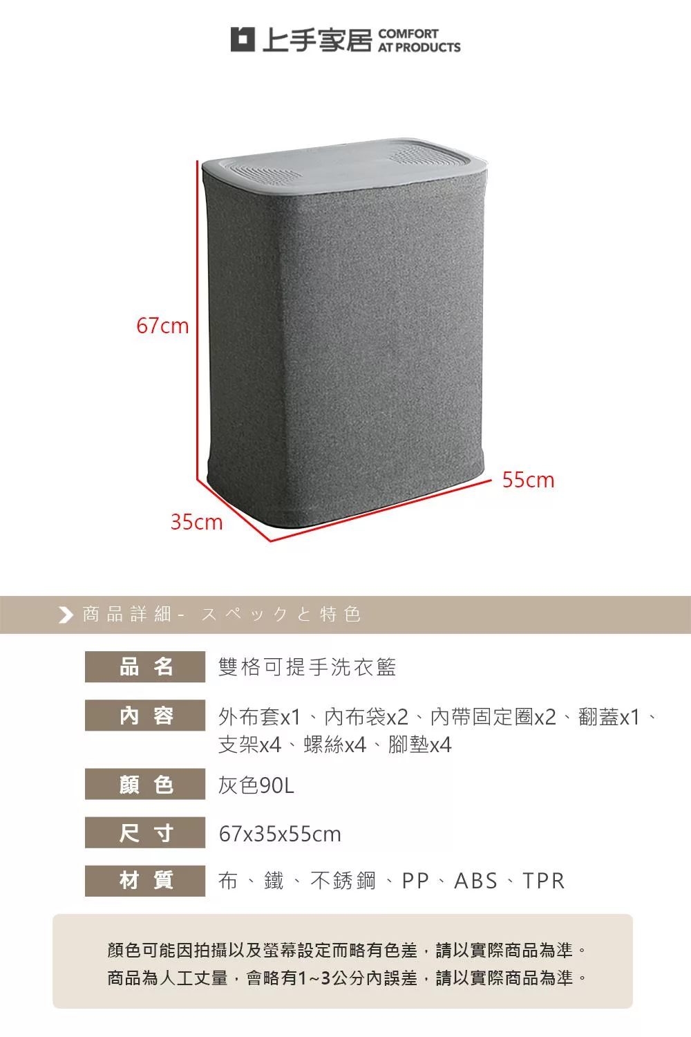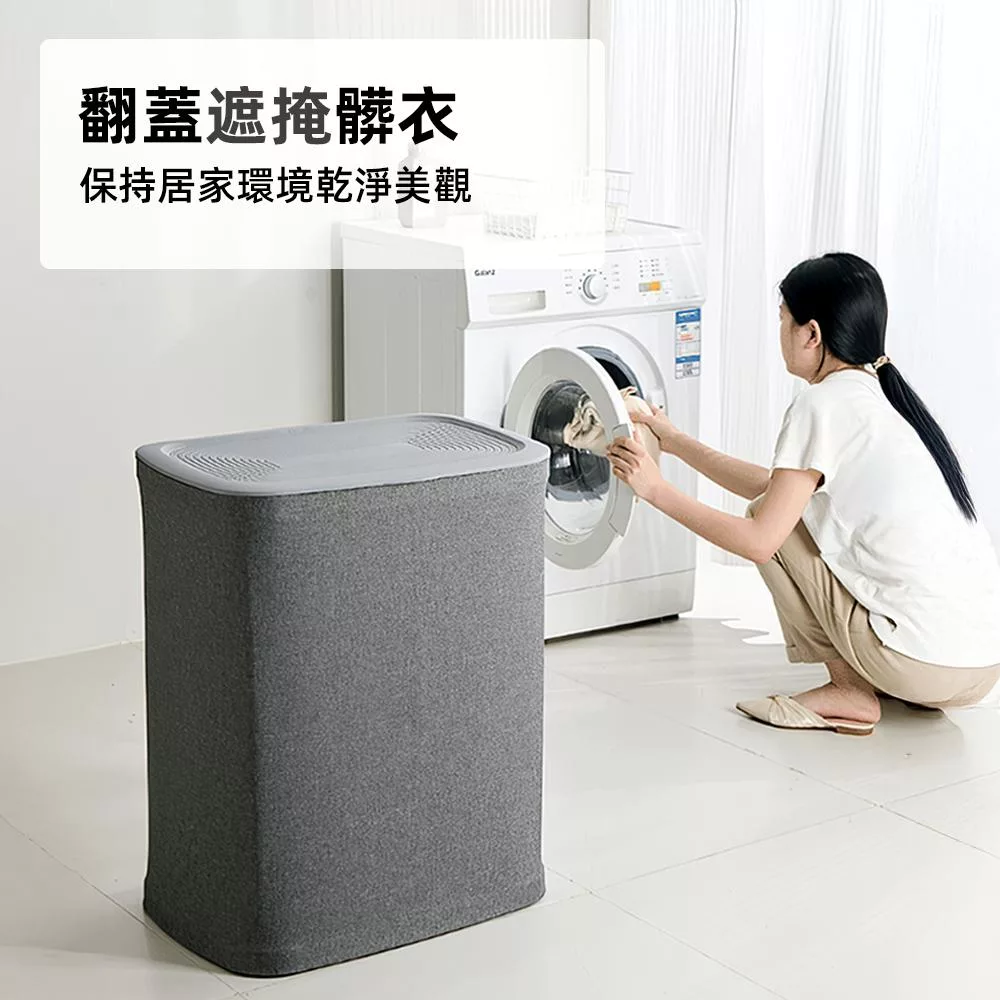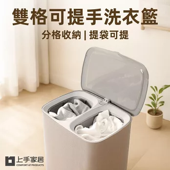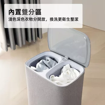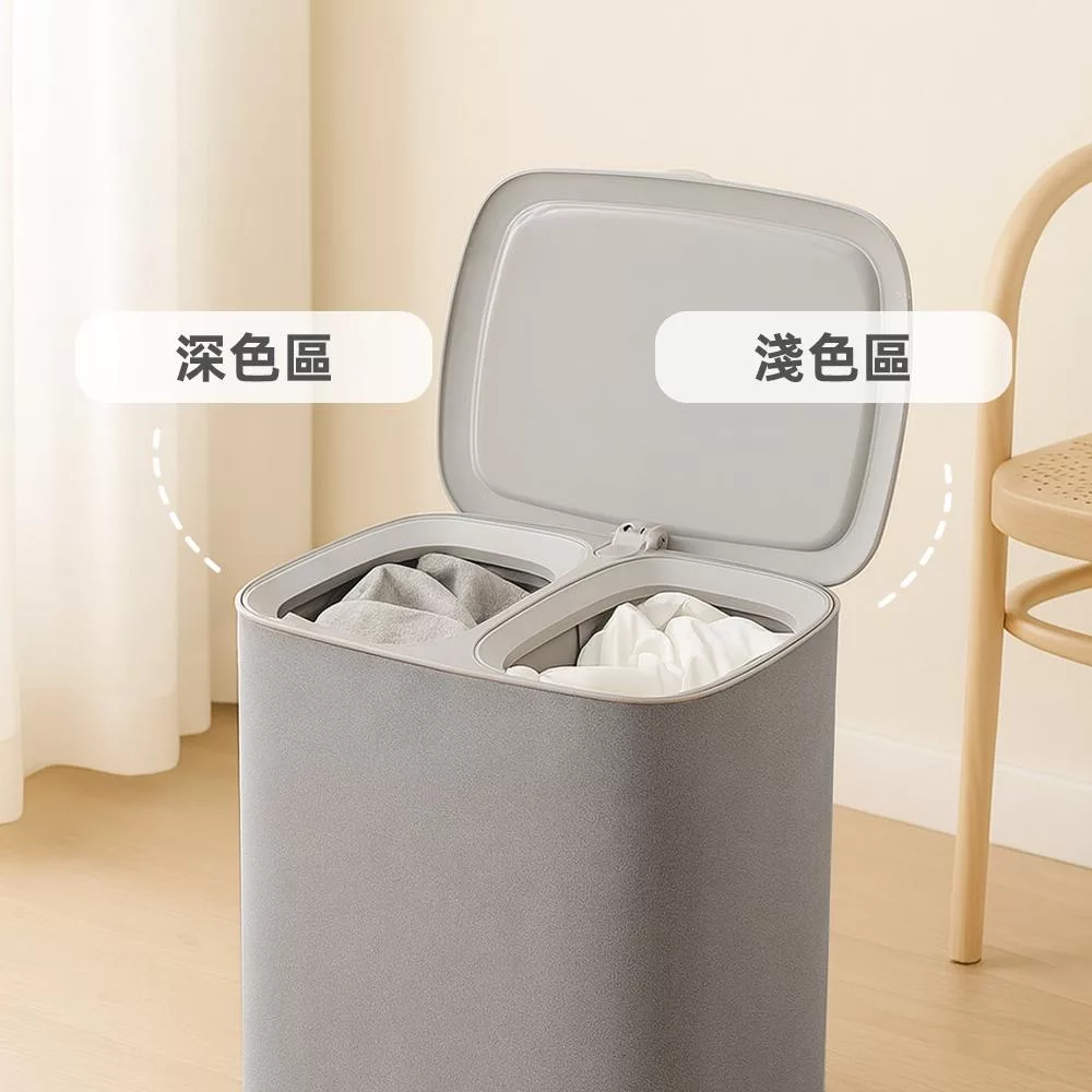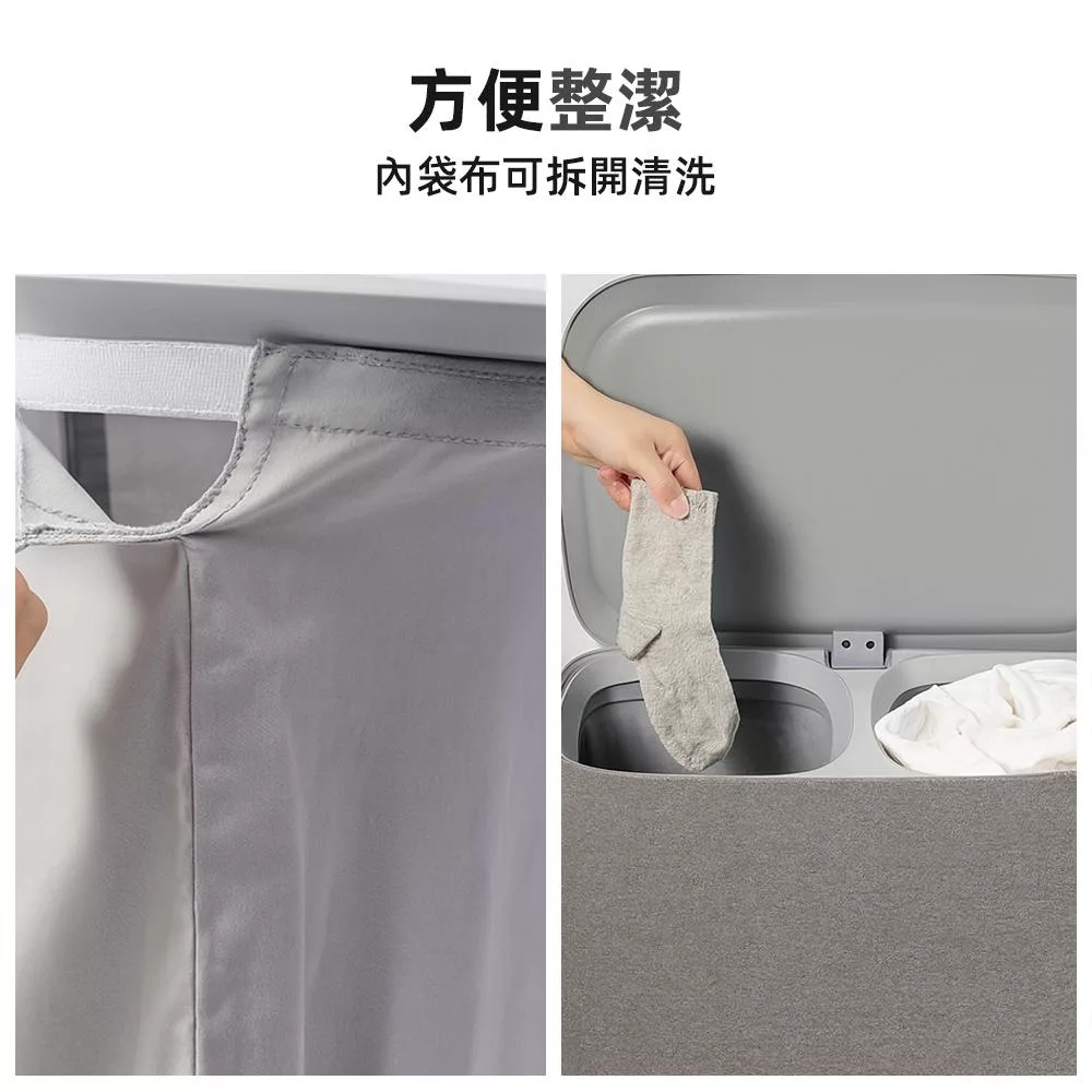 這款雙格可提手洗衣籃內建雙分區設計,可將深淺衣物分開放置,乾淨又衛生。每格內袋皆可獨立提取,直接拎到洗衣機省力又方便。翻蓋設計有效遮掩髒衣氣味,灰色布質外觀簡約大方,讓居家角落依然整潔有序。