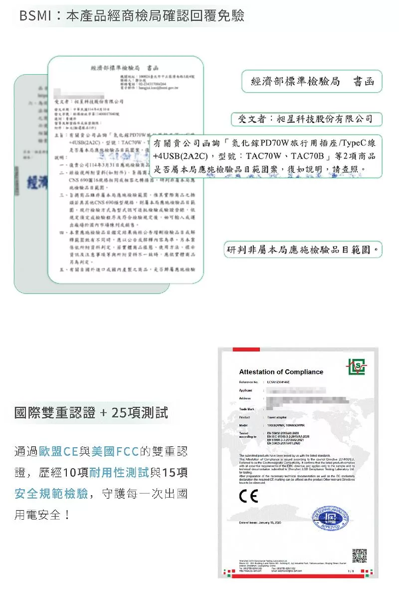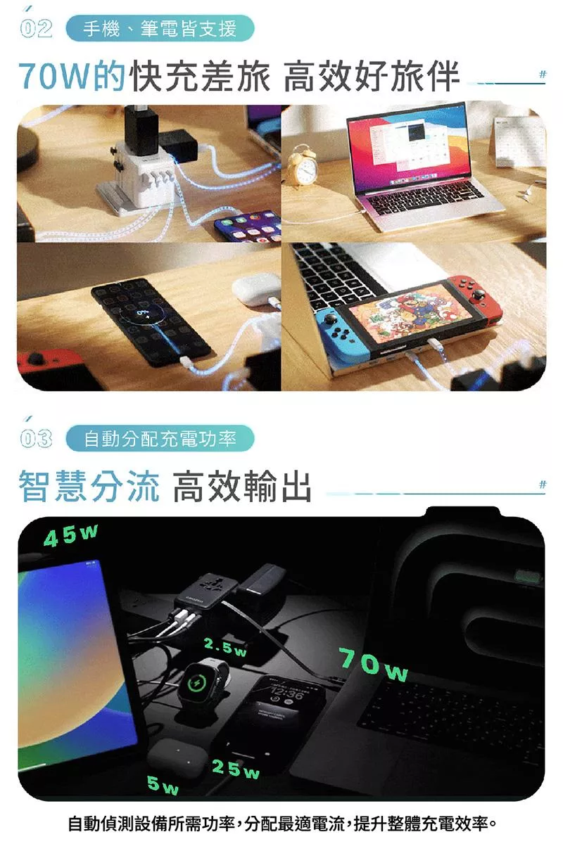 1.氮化鎵高速快充 PD70W/QC3.0,節能省電省時。