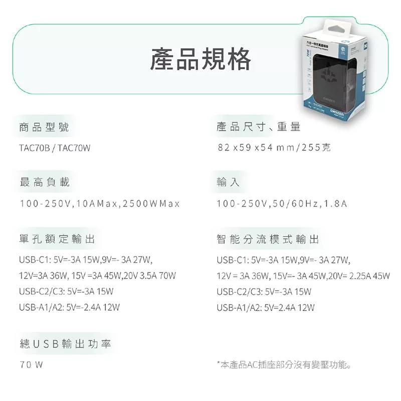 【太星電工】氮化鎵PD70W萬國轉換頭/萬國轉接插座 筆電充電 手機充電 高速快充 出國旅行5USB(2A3C) AA306