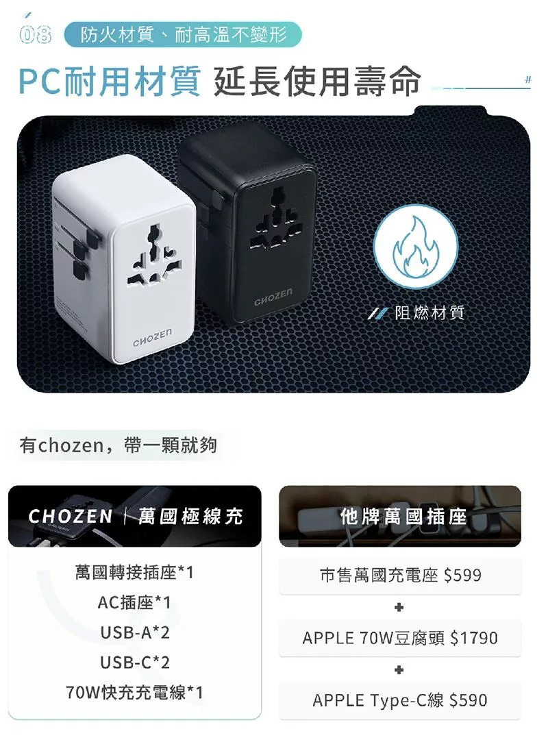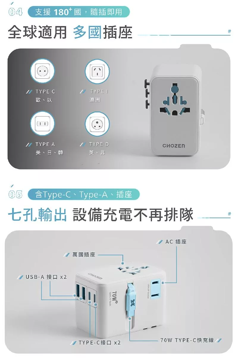 CHOZEN PD70W氮化鎵 六合一快充萬國轉換插頭 附線 出國1顆搞定 硯墨黑