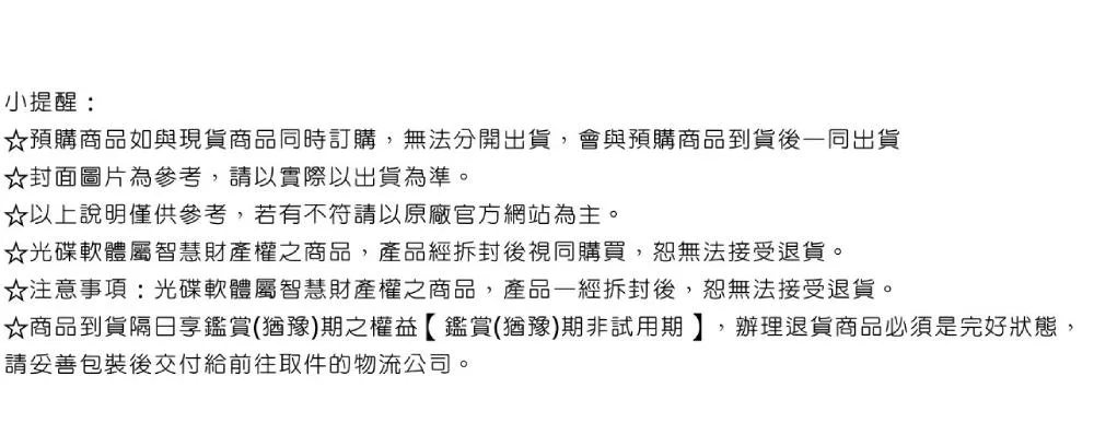 下列商品購買後博客來不提供10天的猶豫期,請務必詳閱商品說明並再次確認確有購買該項商品之需求及意願時始下單購買,有任何疑問並請先聯繫博客來客服詢問: