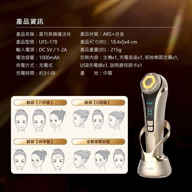 內容物:主機x1、充電底座x1、卸妝棉固定圈x1、USB充電線x1、說明書保固卡x1
