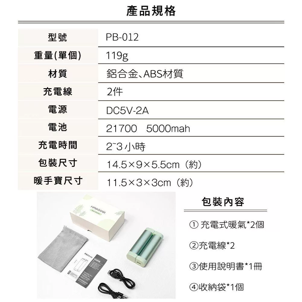 內容物:暖手寶x1、充電線×2、說明書×1、收納袋×1