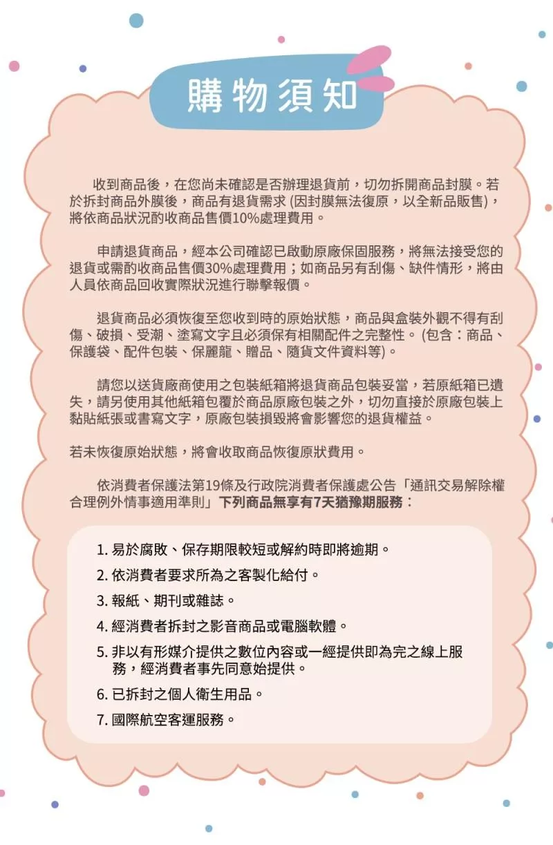 非屬上列品項之商品均享有到貨十天的猶豫期(含例假日)。退回之商品必須於猶豫期內寄回。
