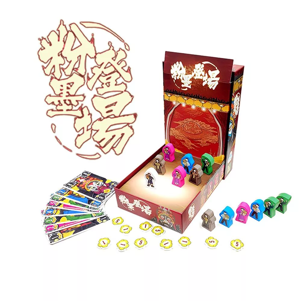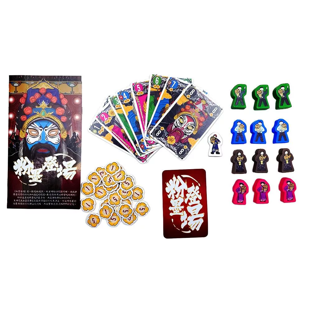 《粉墨登場》是一款吃墩遊戲,玩家將扮演劇團經理,彼此爭奪最優秀的伶人加入自己的劇團。本遊戲採用必跟型吃墩規則,但你追求的不是吃下最多墩,而是爭取舞台上的伶人。王牌花色由當前舞台上最具價值的伶人來決定,但這將隨著你招募與操控伶人的過程,而在整個遊戲過程中不斷變化。
