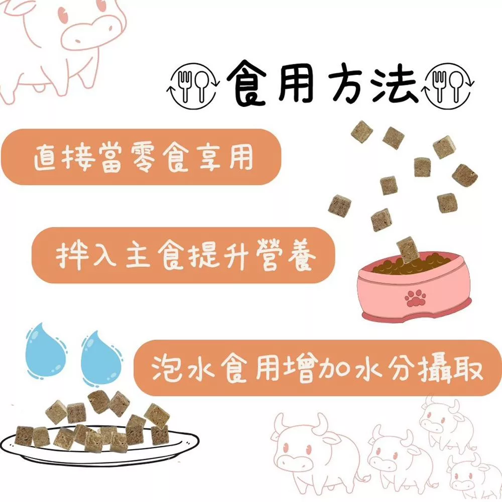 多種吃法—可直接當零食享用、拌入主食提升營養,或加水還原幫助貓咪補充水分。