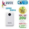 【ADATA 威剛】C100 10000mAh 20W PD/QC 3孔 輕薄極速Type-C雙向快充行動電源 皓月白