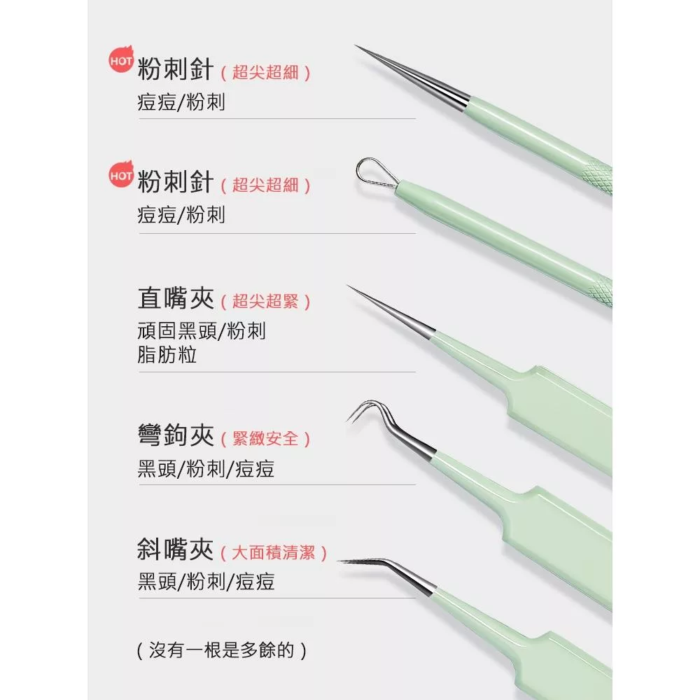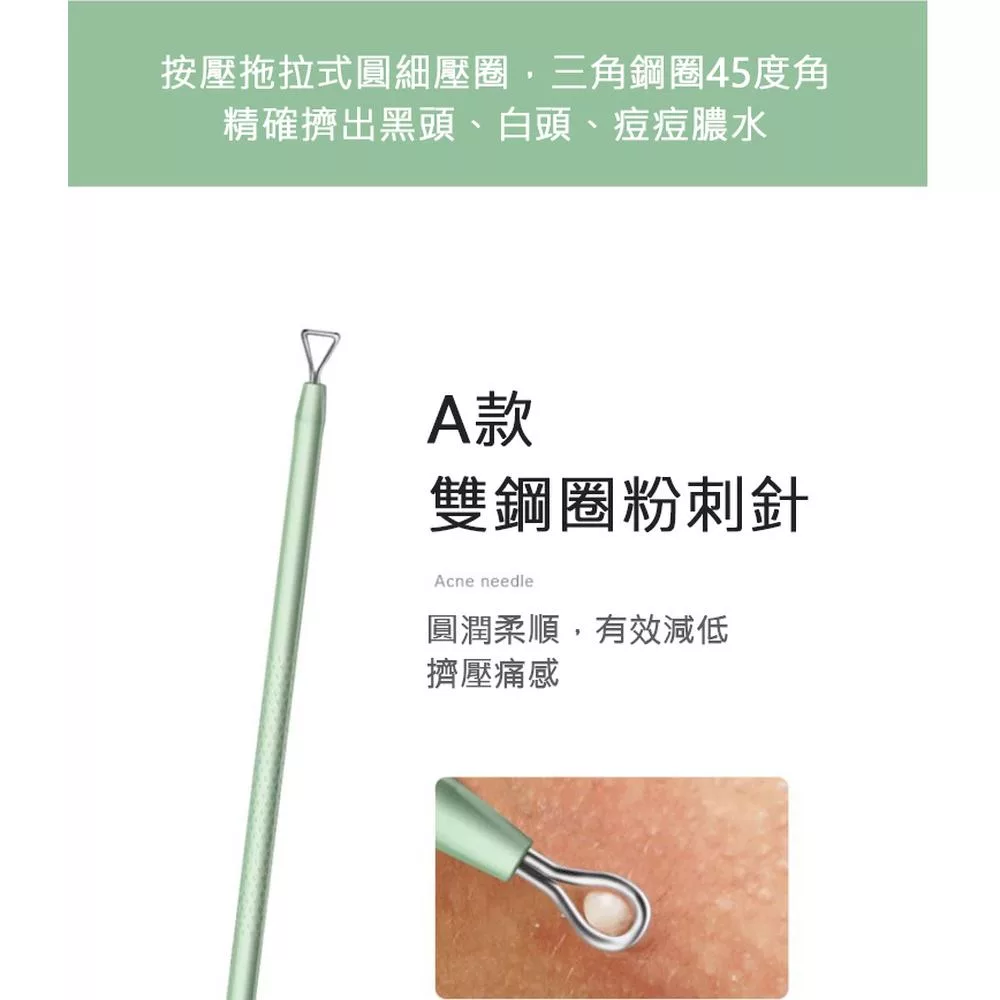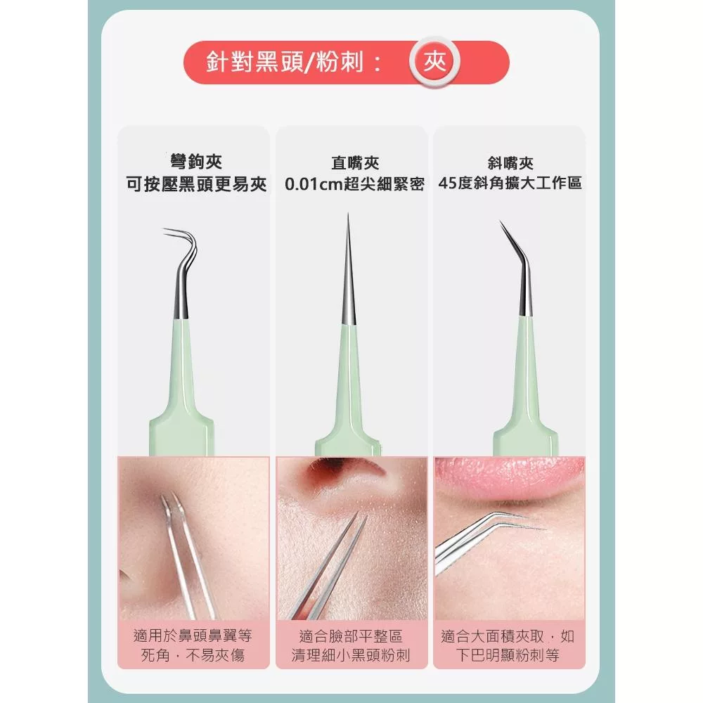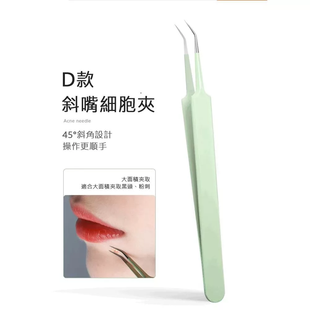 有效清除臉部髒污,清除臉上粉刺、黑頭,輕鬆對抗鼻頭、鼻側、嘴角等頑固部位,避免雙手擠壓造成的皮膚不適,不鏽鋼材質,可清洗防鏽耐用,以針端輕點出黑頭粉刺,斜嘴粉刺夾,輕鬆夾取浮於表面的粉刺
