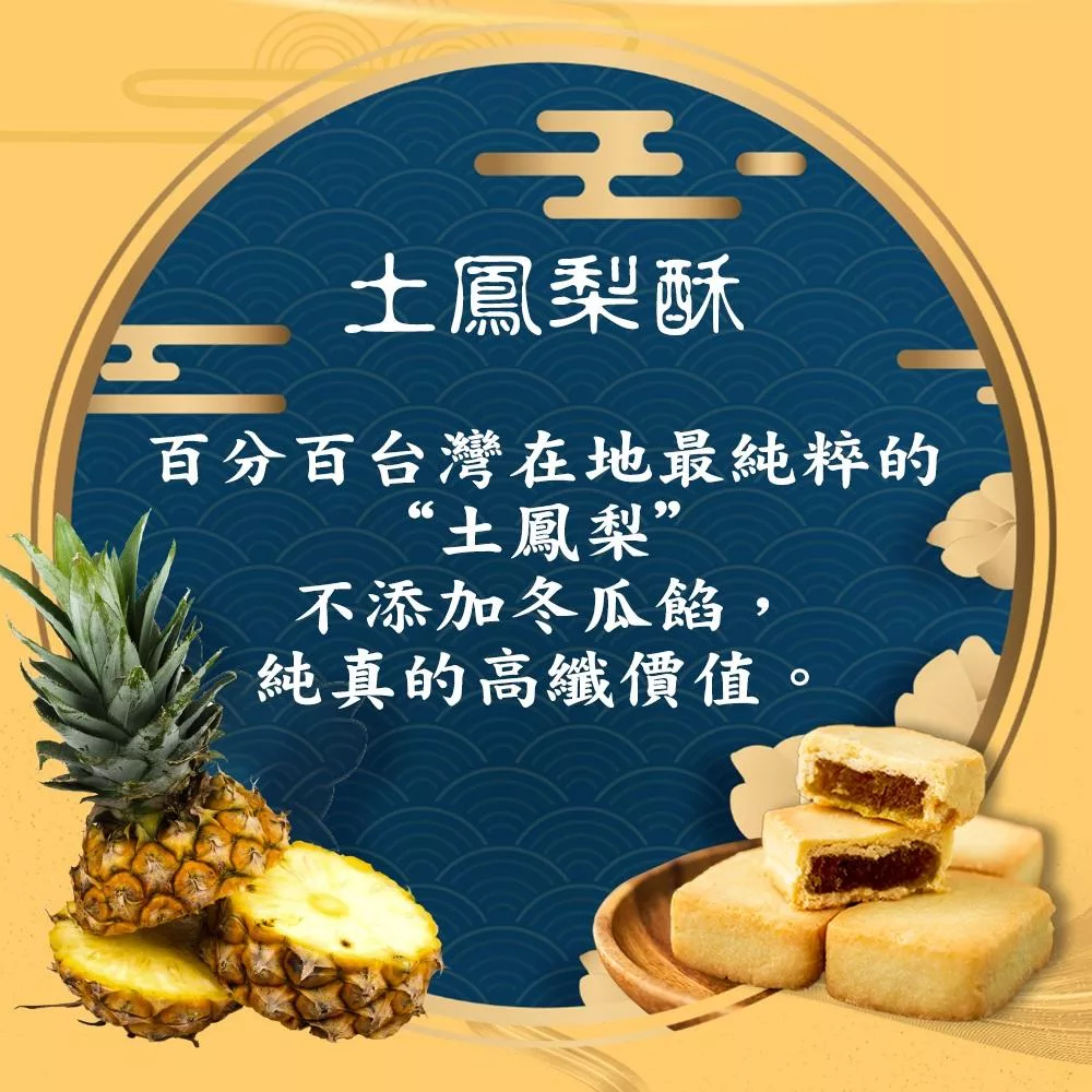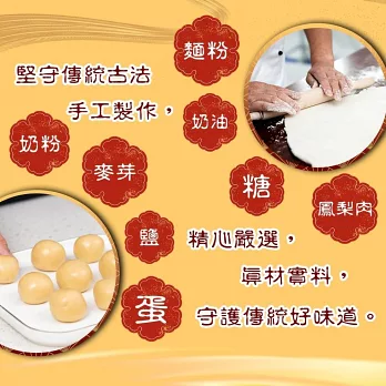 土鳳梨酥-麵粉、奶油、糖、蛋、奶粉、鳳梨肉、麥芽、檸檬酸、鹽。