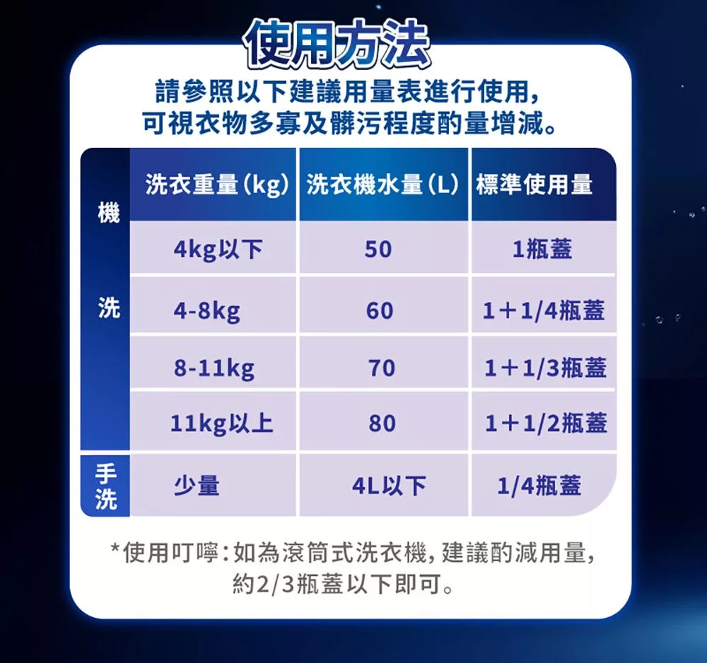 使用方法:請參照以下建議用量表進行使用,可視衣物多寡及髒汙程度酌量增減。