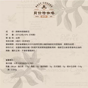 賞味期限:拆封後建議在30天內食用完畢以確保咖啡的完美風味、新鮮及品質。