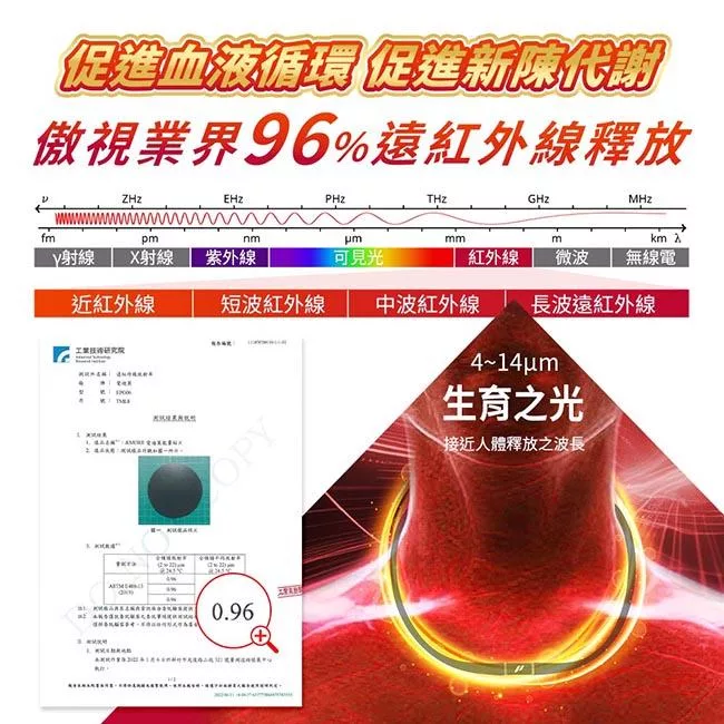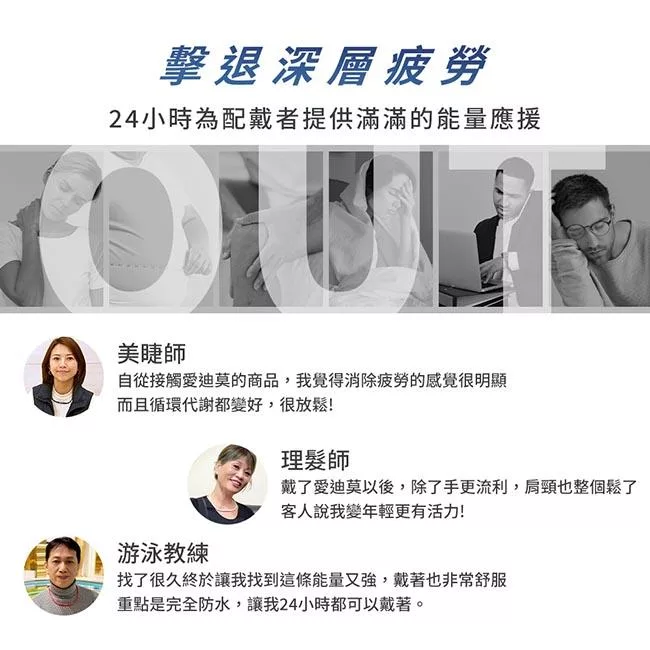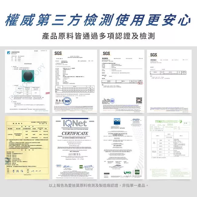 愛迪莫通過第三方公正單位檢驗,多項認證報告,各式專利,SGS、紡研所、工研院測試,促進血液循環、促進新陳代謝、消除疲勞。