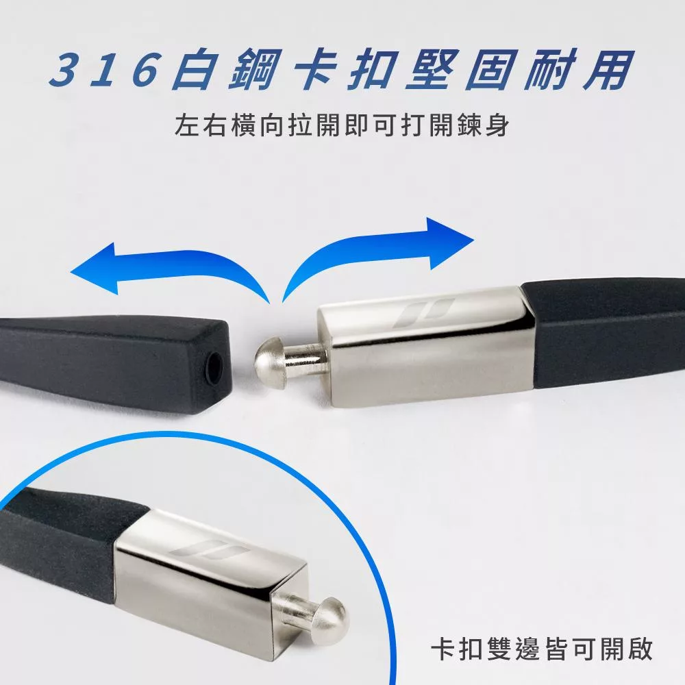 鍊身使用高彈性優質矽膠材質,具備優異的抗水、抗汗、抗汙與抗敏效果,即使長時間配戴或在運動、洗澡、游泳等環境中使用,也能維持穩定品質。搭配316L不鏽鋼卡扣設計,堅固耐用不易鬆脫,耐磨抗鏽,質感與功能兼具。