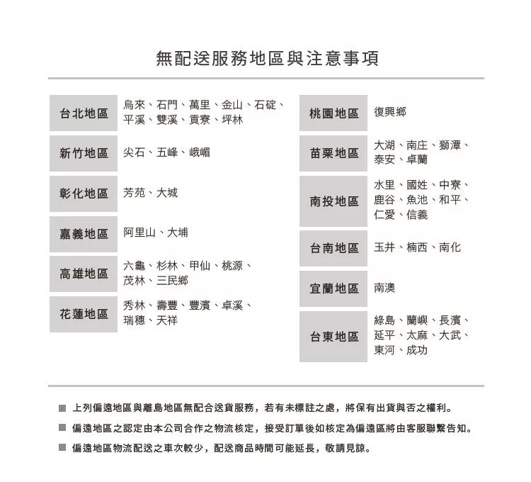 - 2除特殊商品送達時間於產品說明中另有標註外,原則上商品將於訂單完成、付款成功後 7 個工作天內送達(不含週六日)。