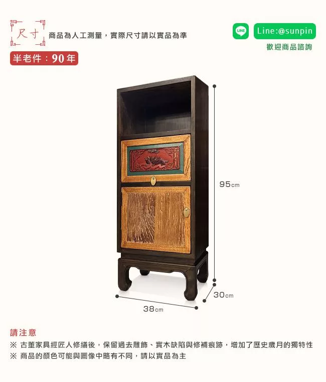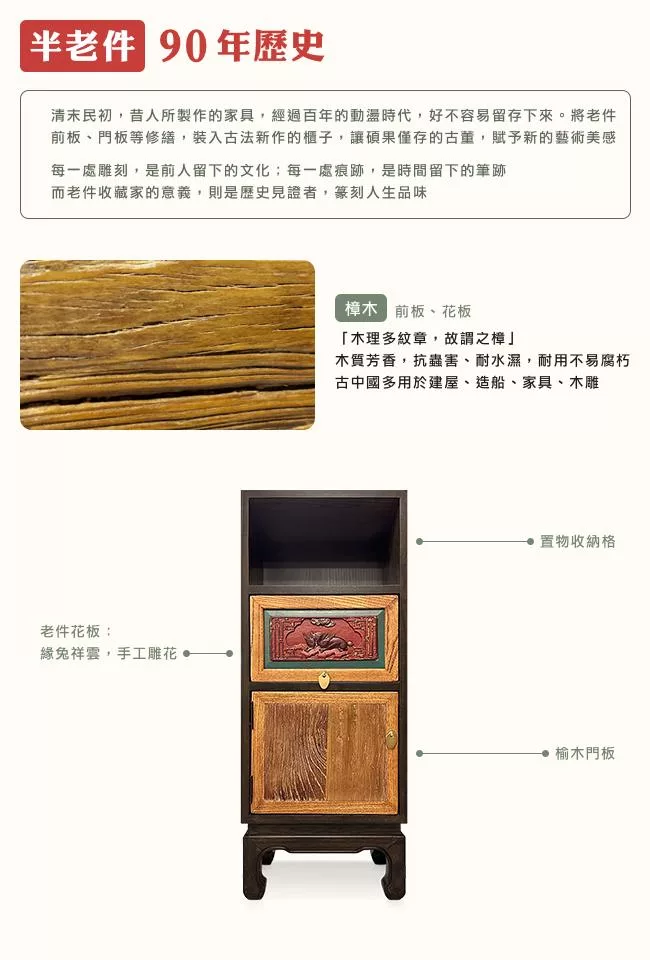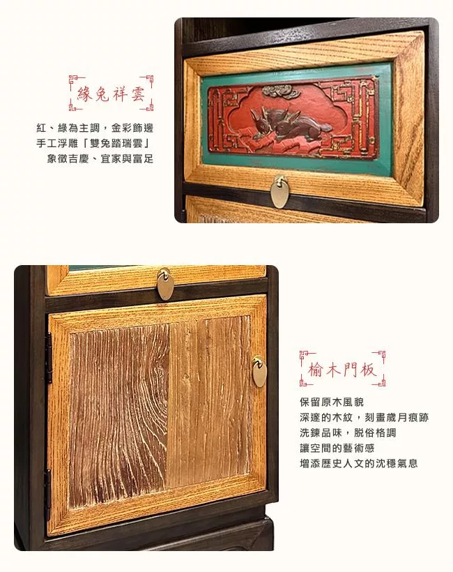 【C’est Chic】月瀾映波雙抽雙門榆木雕刻櫃(純老件100年)-幅100cm