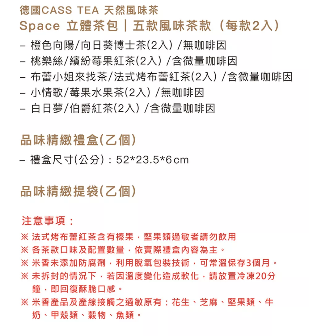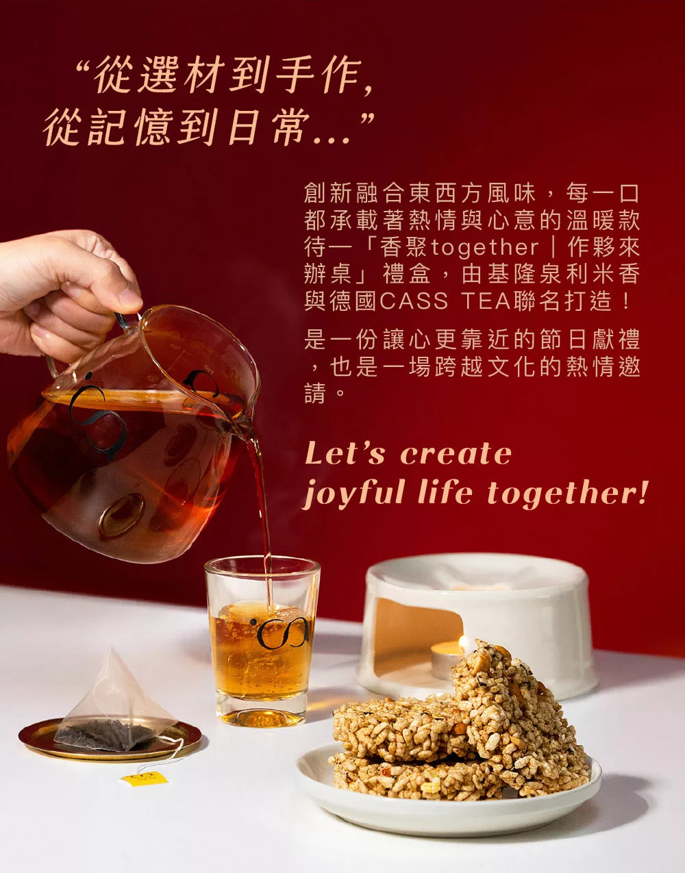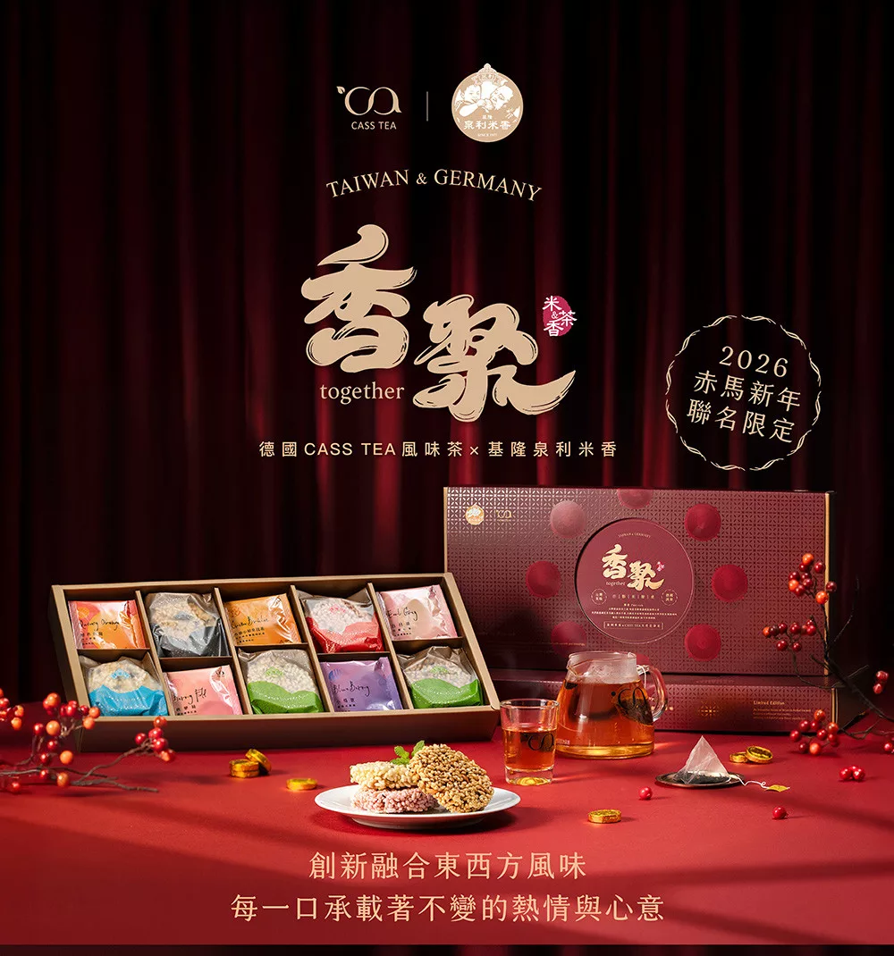 與基隆泉利米香聯名攜手,推出五款獨家中秋限定的「茶香風味米香」,將德國花草茶的細緻芳香,融入台灣在地傳承手藝米香,搭配德國CASS TEA花果茶,每一口美味皆傳遞著滿滿的祝福與用心。