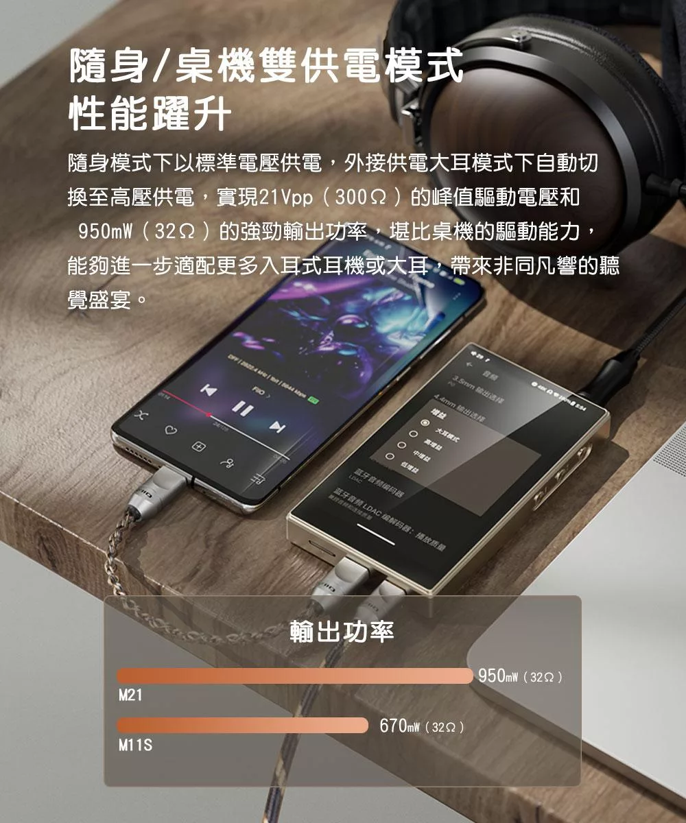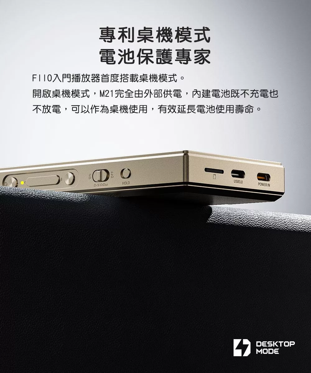 FIIO入門播放器首度搭載桌機模式。開啟桌機模式,M21完全由外部供電,內建電池既不充電也不放電,可以作為桌機使用,有效延長電池使用壽命。