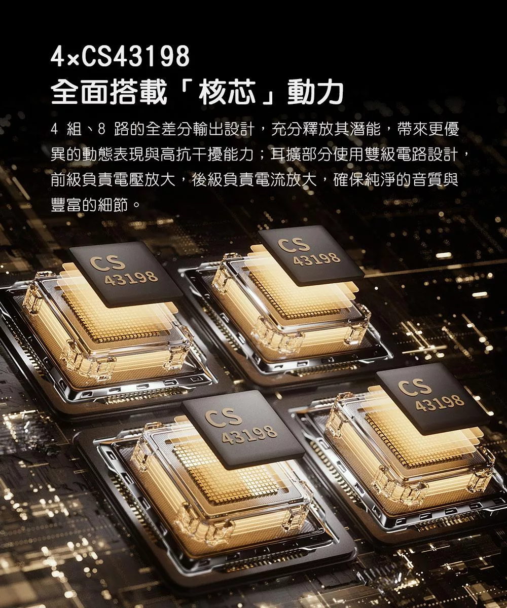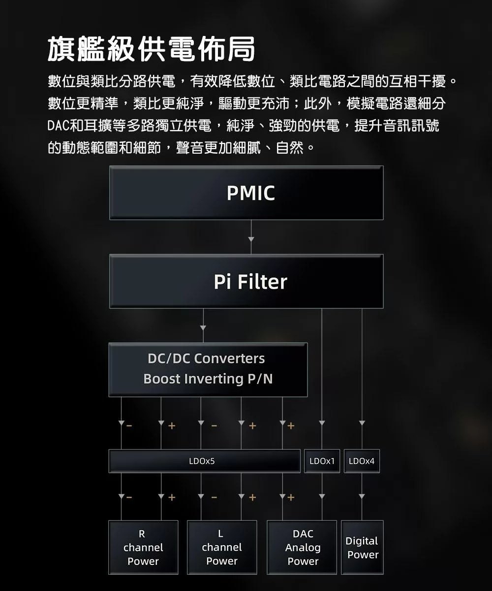 此外,模擬電路還細分DAC和耳擴等多路獨立供電,純淨、強勁的供電,提升音訊訊號的動態範圍和細節,聲音更加細膩、自然。
