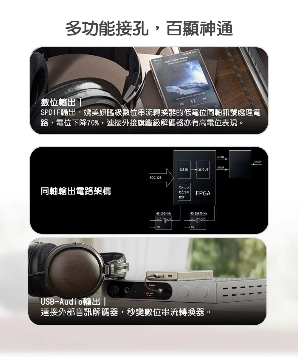 耳擴部分使用雙級電路設計,前級負責電壓放大,後級負責電流放大,確保純淨的音質與豐富的細節。
