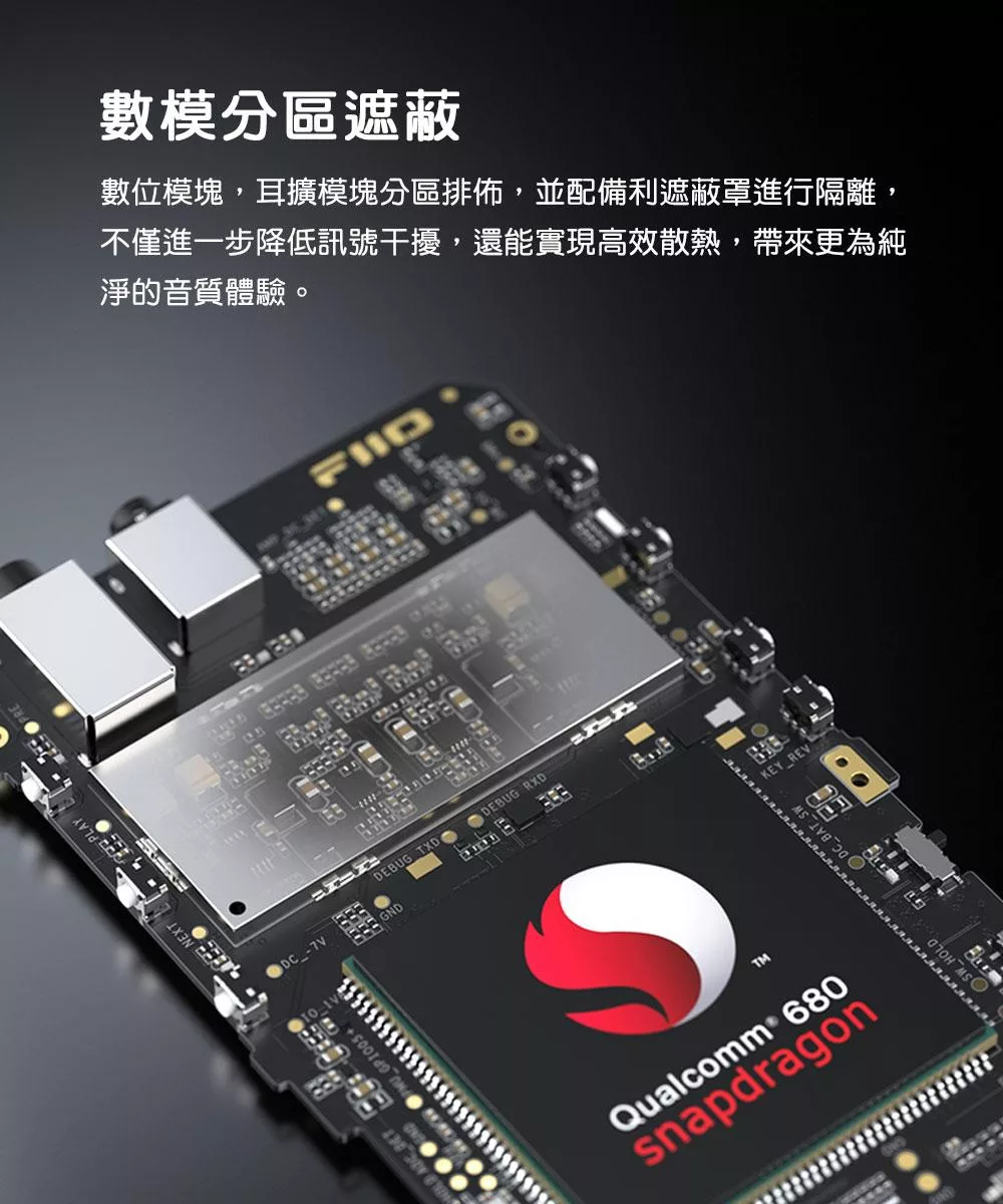 數位模塊,耳擴模塊分區排佈,並配備利遮蔽罩進行隔離,不僅進一步降低訊號干擾,還能實現高效散熱,帶來更為純淨的音質體驗。